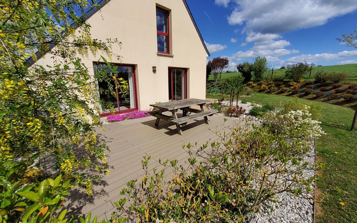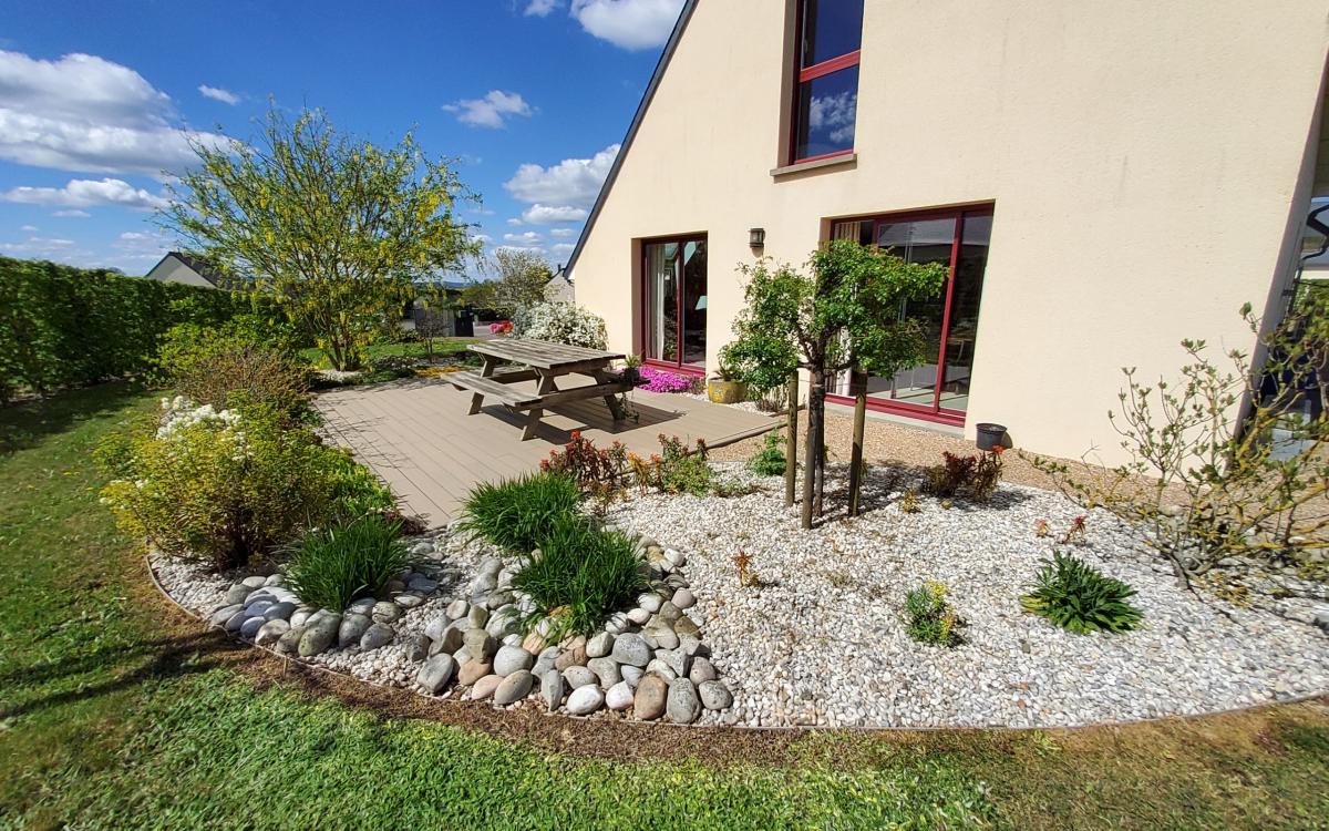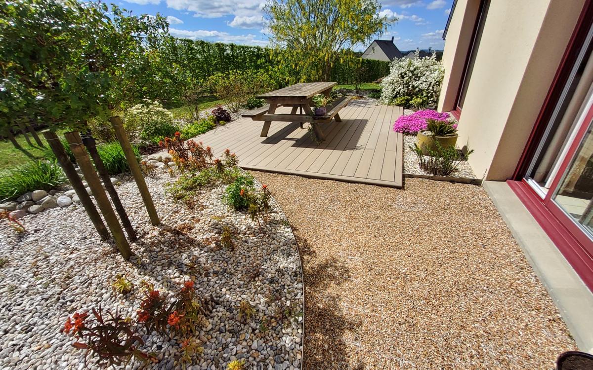Terrasse, jardin arboré et paysagé, terrain de 1500 m².
