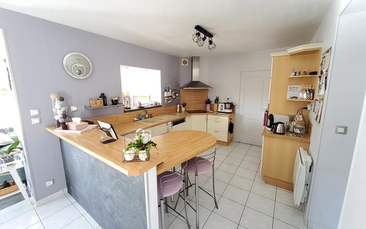 - au rez-de-chaussée : séjour-salon avec poêle à granules, cuisine ouverte aménagée et équipée, salon donnant sur terrasse plein sud, chambre, wc, salle d'eau.